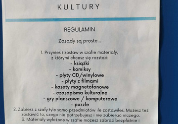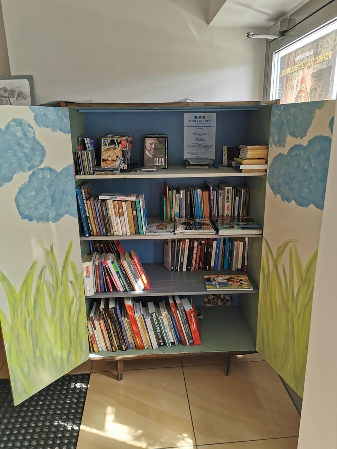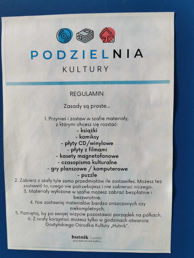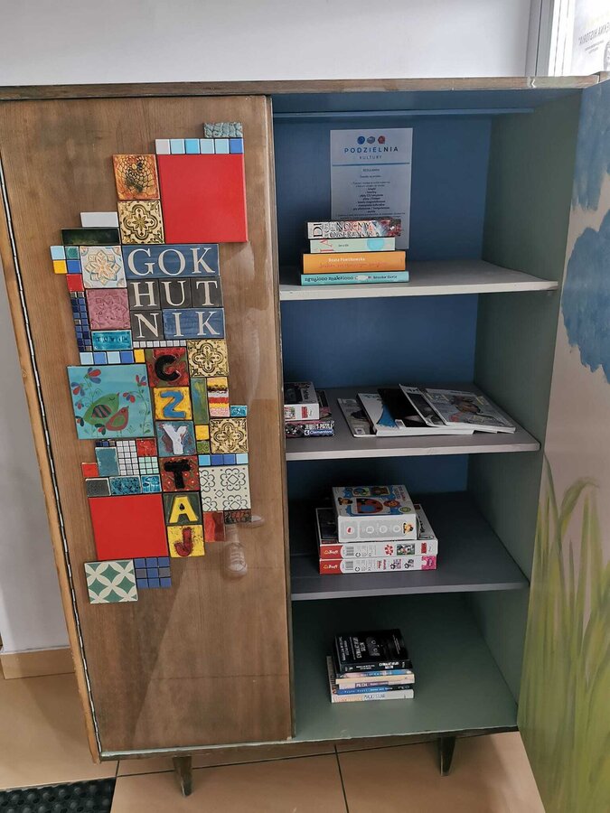 W Gostyńskim Ośrodku Kultury "Hutnik" funkcjonuje Podzielnia Kultury. To miejsce - szafa przy wejściu głównym - służące do wymiany książek, czasopism kulturalnych, płyt z muzyką i filmami, gier planszowych, puzzli. Metamorfozę szafy przeprowadzili wolontariusze GOK "Hutnik", a blasku i oryginalności dodały jej ceramiczne dodatki powstałe w Pracowni Ceramiki działającej w "Hutniku".